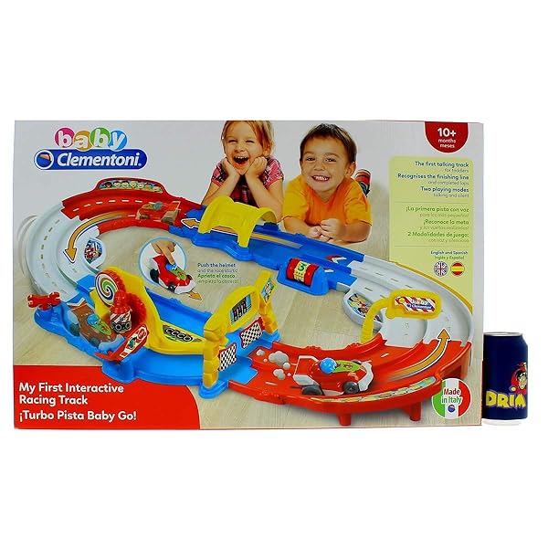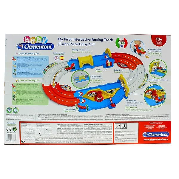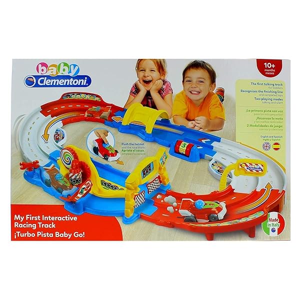 - Una pista con un coche interactivo que habla al presionar la cabeza del conductor, el coche comienza a acelerar por la pista, contando las vueltas