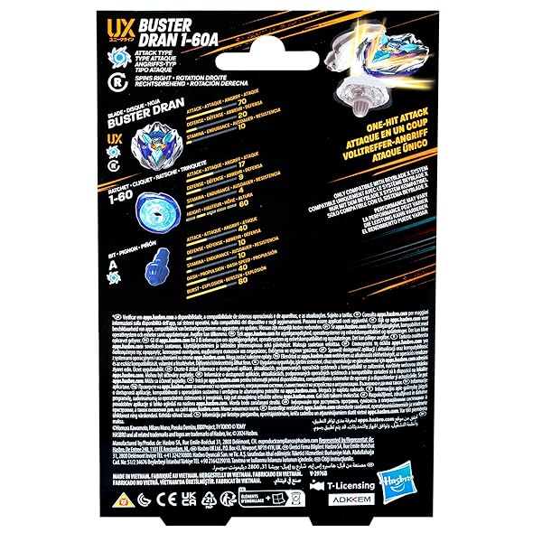 - HOJAS INTERCAMBIABLES DE METAL FUNDIDO: Incluye top y lanzador Beyblade X con diseño Takara Tomy hechos con auténticas piezas de metal fundido: top tipo ataque de rotación derecha Buster Dran 1-60A UX La gran hoja de ataque única fue diseñada para eliminar oponentes con un solo golpe
