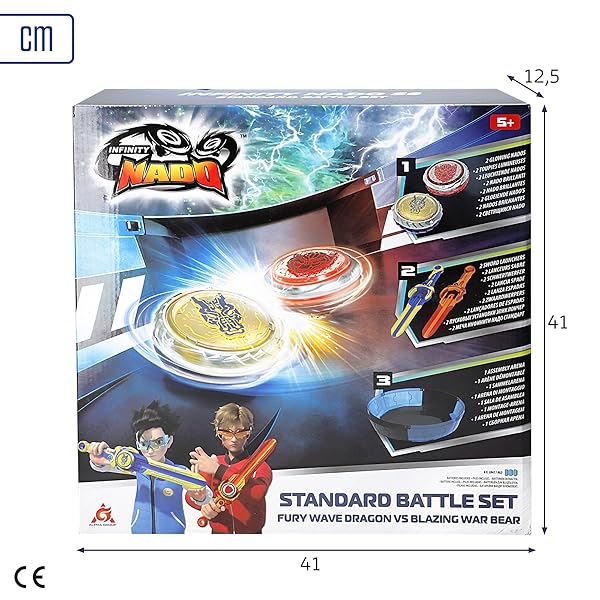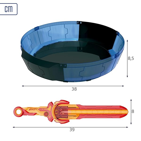 - Incluye: 1 estadio de batalla para montar, 2 peonzas Nado, equilibrio y ataque, 2 espadas lanzadoras, 39 cm, y 1 llave de montaje para cada jugador