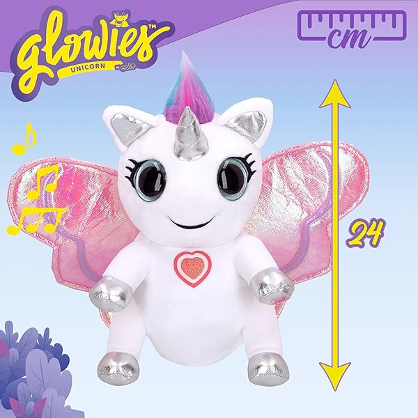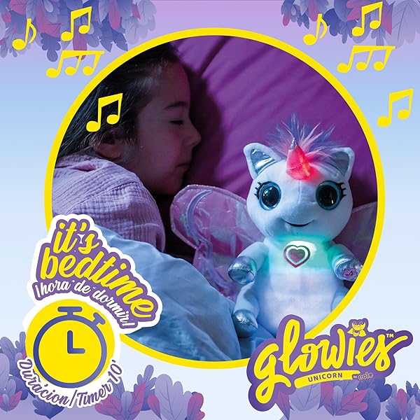- Incluye: 3 canciones de cuna, sonidos relajantes, luces de colores y partes luminiscentes que brillan en la oscuridad (alas, medallón y ojos)