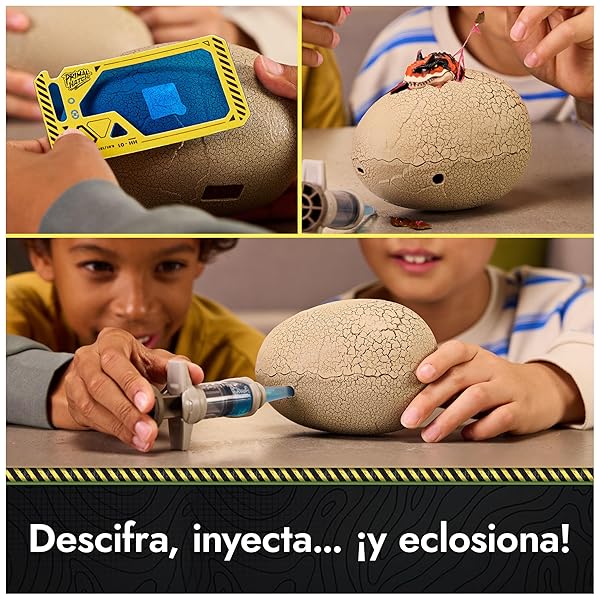 - ECLOSIÓN LLENA DE CIENCIA Y ACCIÓN: Analiza el ADN con el escáner azul, usa la jeringa de juguete y observa cómo el dinosaurio rompe el huevo viscoso y nace por sí solo, como en un auténtico laboratorio secreto