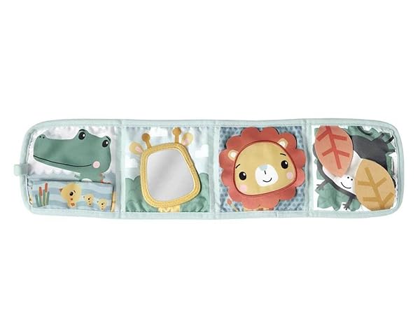 - El bebé descubrirá divertidas actividades, como un espejo de autorreconocimiento, solapas sorpresa, un panel que cruje al arrugarlo, cuentas de sonajero y diferentes texturas.