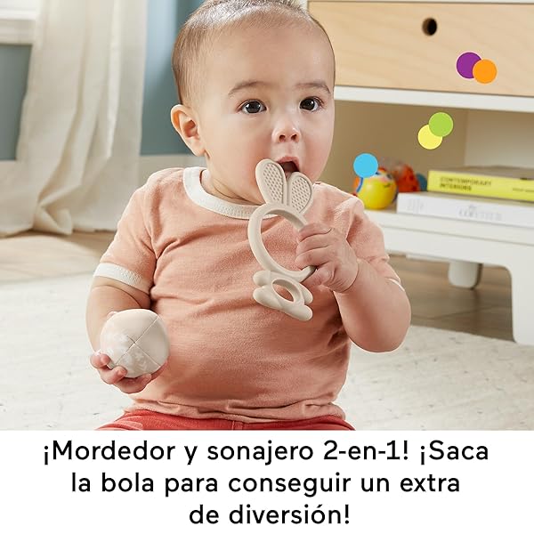 • El mordedor de conejito sin BPA tiene orejas texturizadas y una pelota extraíble con tintineo para las habilidades motoras finas