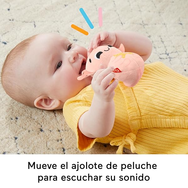 • El ajolote de peluche cuenta con un suave tintineo como recompensa auditiva para practicar un juego de causa y efecto