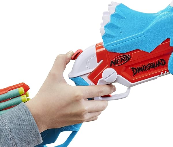 - Precipítate a la acción de triple dardo con el lanzador que tiene detalles de dinosaurio que reproduce la apariencia de un dinosaurio Triceratops