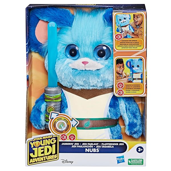 - Modo de entrenamiento Lightsaber: el sable de luz azul puede girar fácilmente hacia arriba y hacia abajo para que los niños puedan imaginar que Nubs está practicando su entrenamiento de sable de luz con el resto de los jóvenes Jedi