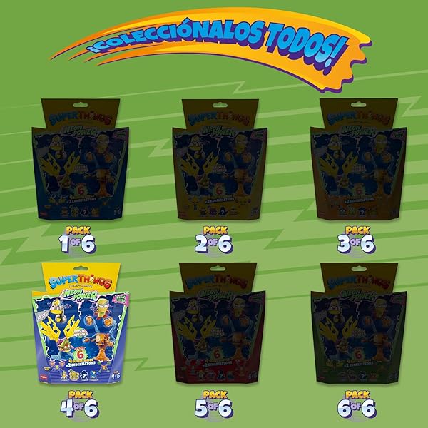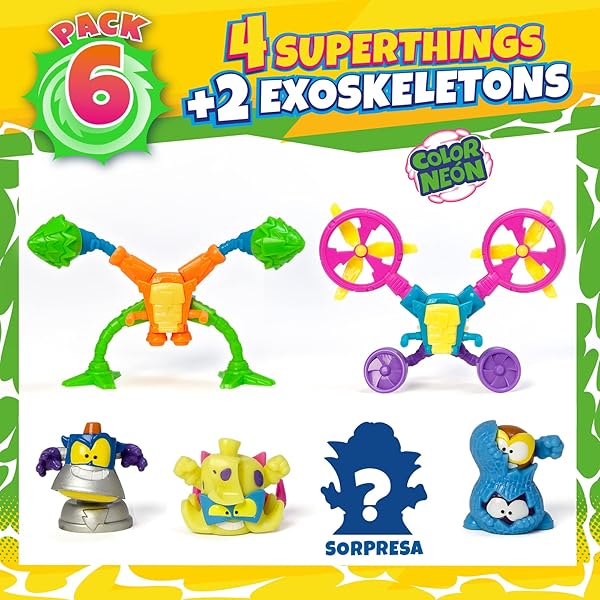• ESCOGE la COMBINACIÓN QUE PREFIERAS – Opción de escoger el pack de 6 específico que se desee. Este pack incluye 4 SuperThings (el capitán plateado Snooplight, el SuperThing con efecto neón Ziggy Beat, el SuperThing Mad Shot, 1 figura SuperThings sorpresa) y 2 Exoskeletons (Water Whirl & Cross Flame)